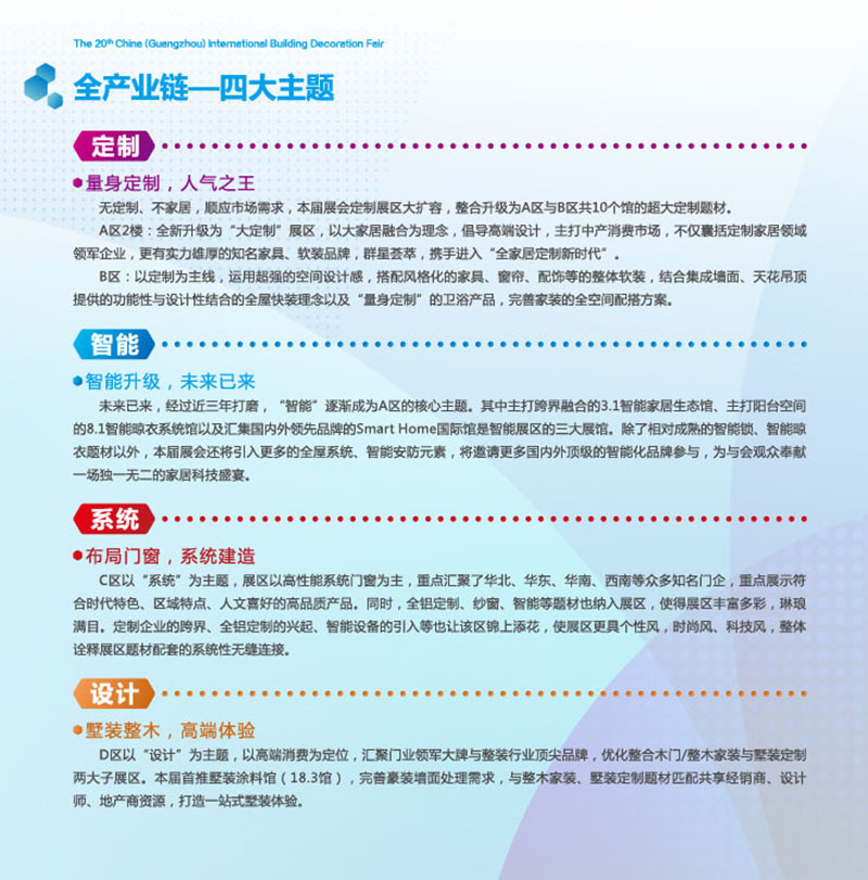 為更好符合市場趨勢,促進家居行業的融合,廣州建博會將首推“大定制”題材,與家居建材行業領軍企業攜手,引領行業發展新風尚。