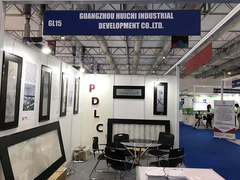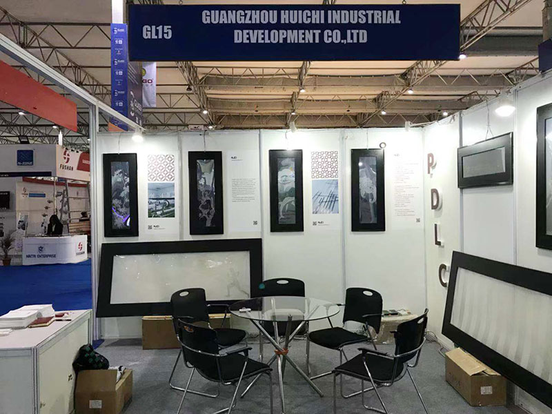 此次參展,廣州匯馳以展示PDLC液晶調光膜為主,讓客商了解調光膜的分區應用。如做成電子墻壁掛畫、動態百葉窗等。以下是展位現場的情況: