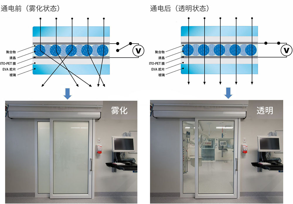 PDLC是一種特殊的復(fù)合液晶材料,它在電的作用下,液晶分子會(huì)呈直列或混亂狀態(tài)。電壓太低,則液晶分子基本無變化(霧化);電壓逐漸升高,部分液晶分子開始呈直列狀態(tài)(半霧化);電壓達(dá)到一度程度,液晶分子全部呈直列狀態(tài)(透明)。